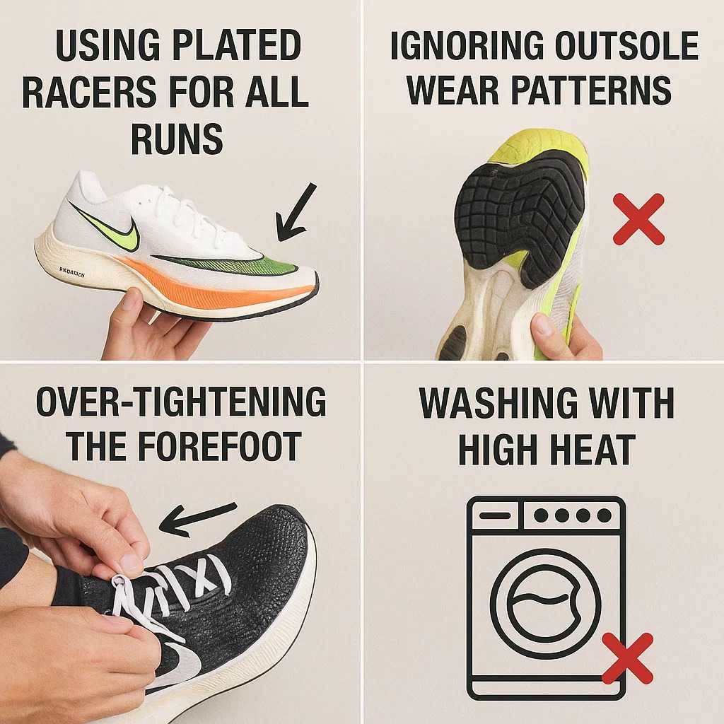 Plated racers, designed for speed, are not ideal for all runs. While they provide maximum efficiency during races or high-speed sessions, using them for easy runs or daily mileage can lead to quicker wear. The materials in these shoes are often softer, and the carbon plates can feel too stiff or harsh for slower-paced runs. It’s best to reserve plated racers for key workouts and races to maintain their performance and prolong their lifespan.