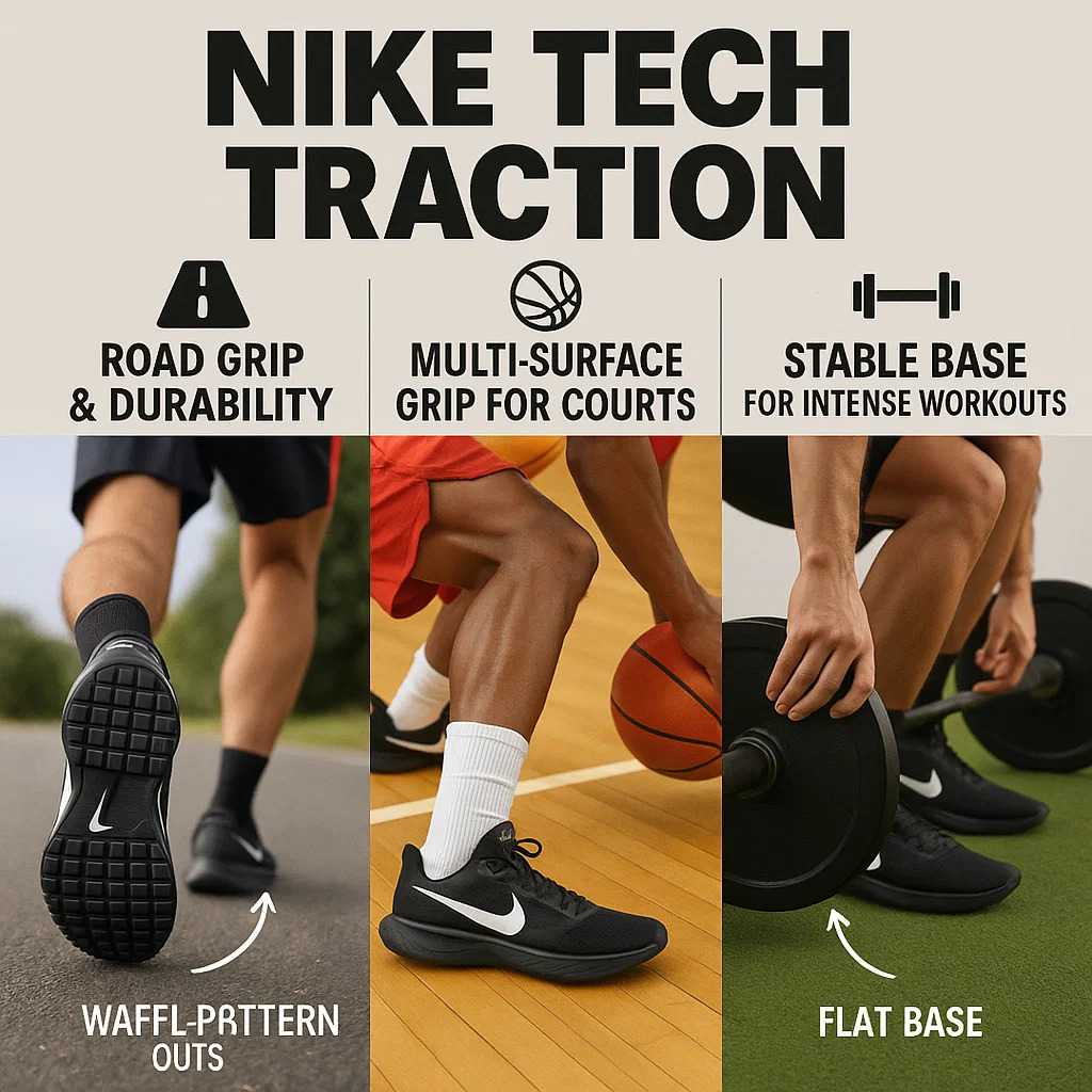 For gym floors or turf, Nike shoes are designed with a flat, wide base and sticky rubber under the forefoot to ensure stability during exercises like weightlifting or sprints. The wide base helps distribute weight evenly, providing a solid platform for lifting or explosive movements. The sticky rubber offers superior traction on flat, synthetic surfaces, ensuring the shoe grips the ground firmly to support fast, powerful movements without slipping.