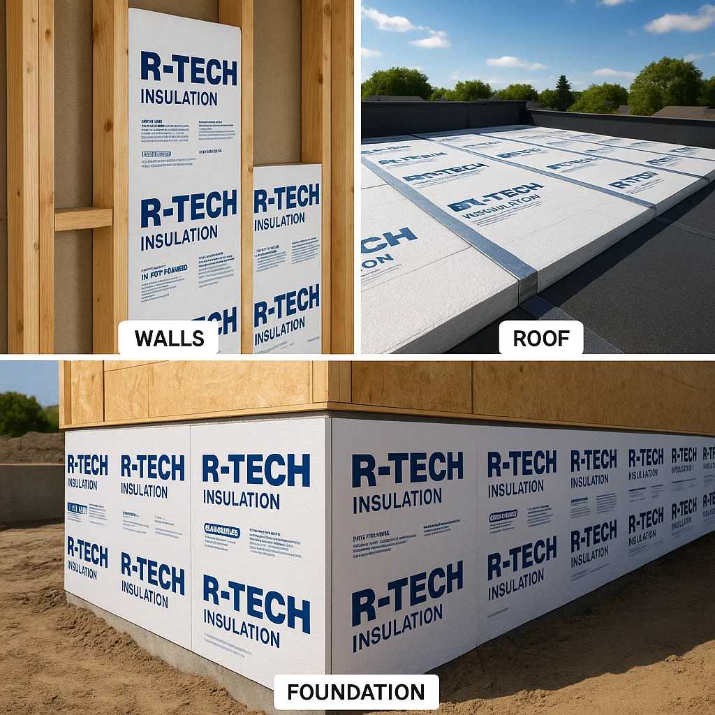 - Foundations: R Tech Insulation is commonly used in foundation systems, where it prevents heat loss from below-ground areas and contributes to structural stability by reducing the risk of moisture-related issues.