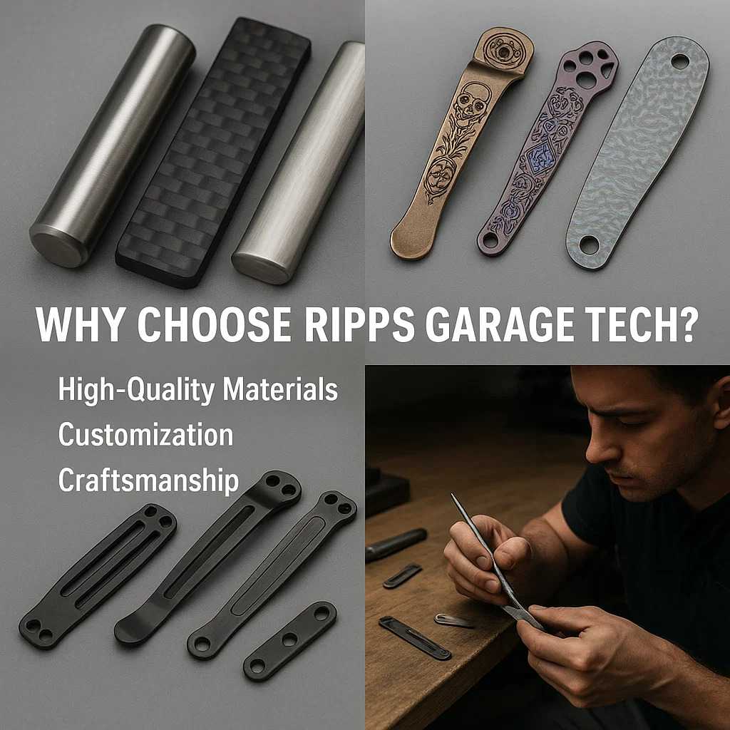 Ripps Garage Tech products are crafted using the best materials available. This includes high-quality titanium, stainless steel, and carbon fiber, which ensure the durability and longevity of the products. Titanium clips, for example, are known for their lightweight yet robust nature, making them ideal for everyday carry (EDC) knives.